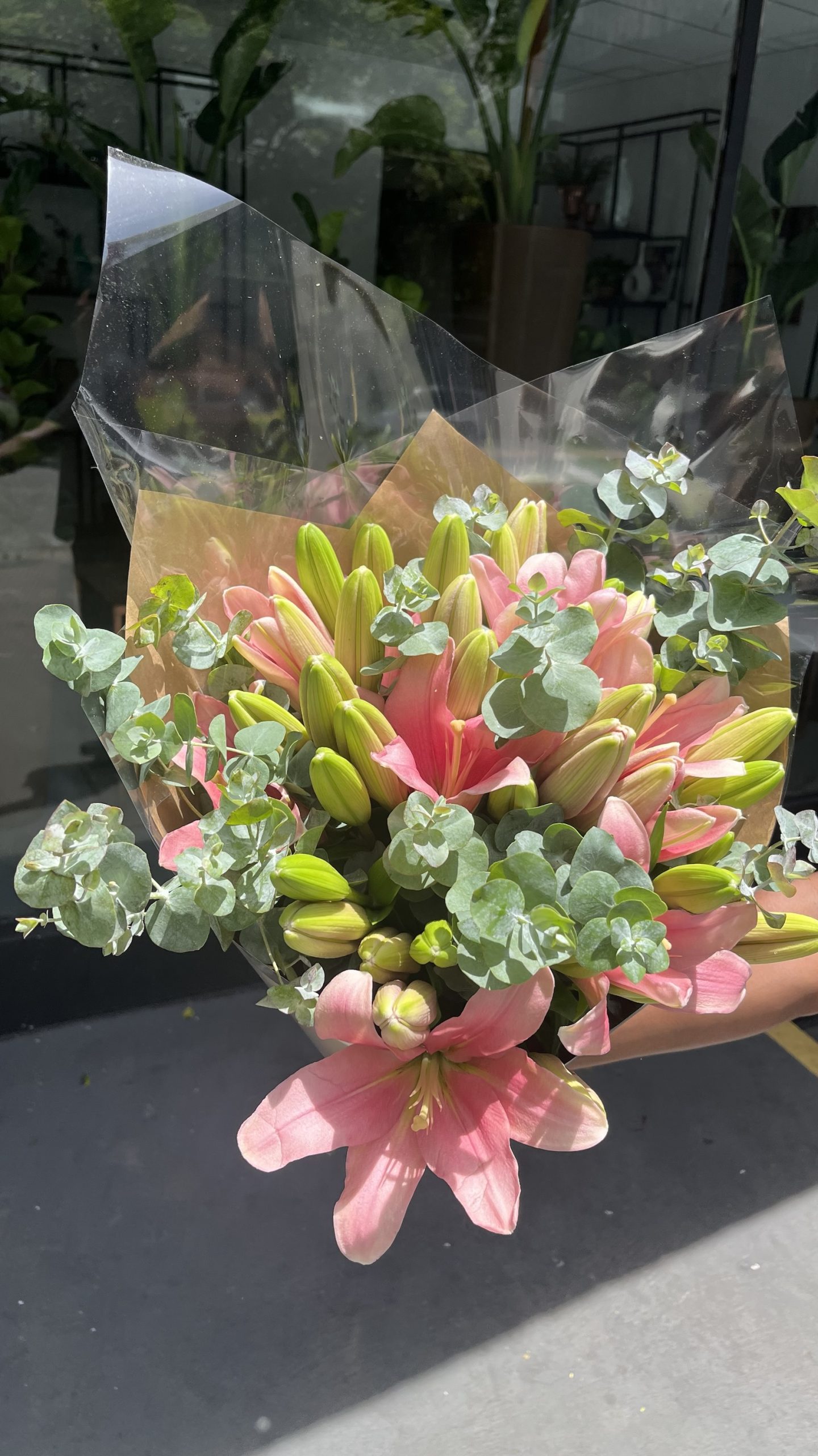 Composição: 15 hastes de lirios rosa e folhagens de eucalipto.