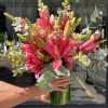 Composição: lírio rosa dobrado, rosas Garden, boca de leão rosa e folhagens.