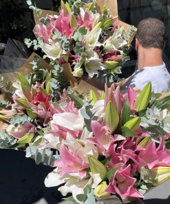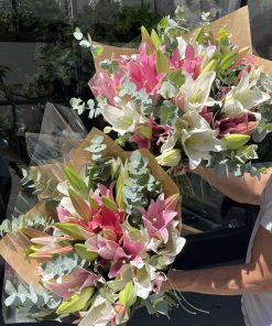 Composição: Um buquê com 5 hastes de lírios rosa, 5 hastes de lirio branco e folhagem de eucalipto.