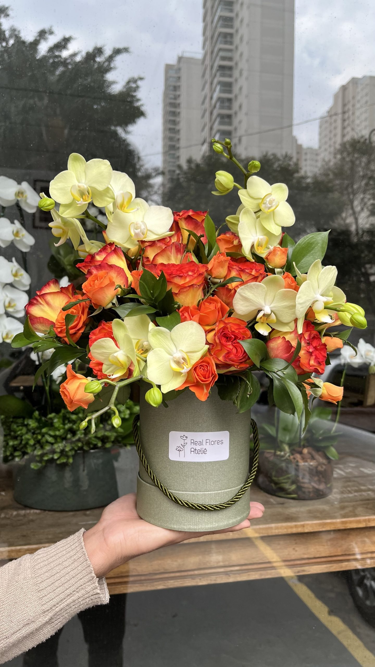 Composição: rosas laranja, rosa spray laranja, orquídea verde e folhagens de ruscus.